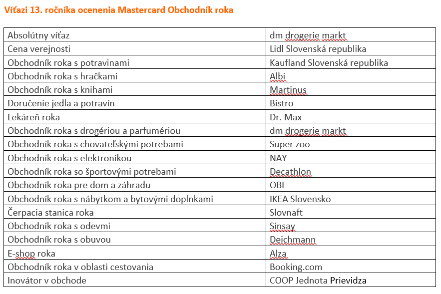 Sieť dm drogerie markt sa stala absolútnym víťazom ocenenia Mastercard Obchodník roka. Zákazníci si v hlasovaní v kategórii Cena verejnosti zvolili za svojho favorita Lidl. Víťazmi sortimentných kategórií sa stali Albi, Alza, Bistro, Booking.com, Decathlon, Deichmann, dm drogerie markt, Dr. Max, IKEA, Kaufland, Martinus, Nay, Obi, Sinsay, Slovnaft a Super zoo. V kategórii odbornej poroty Inovátor v obchode zvíťazila spoločnosť Coop Jednota Prievidza.